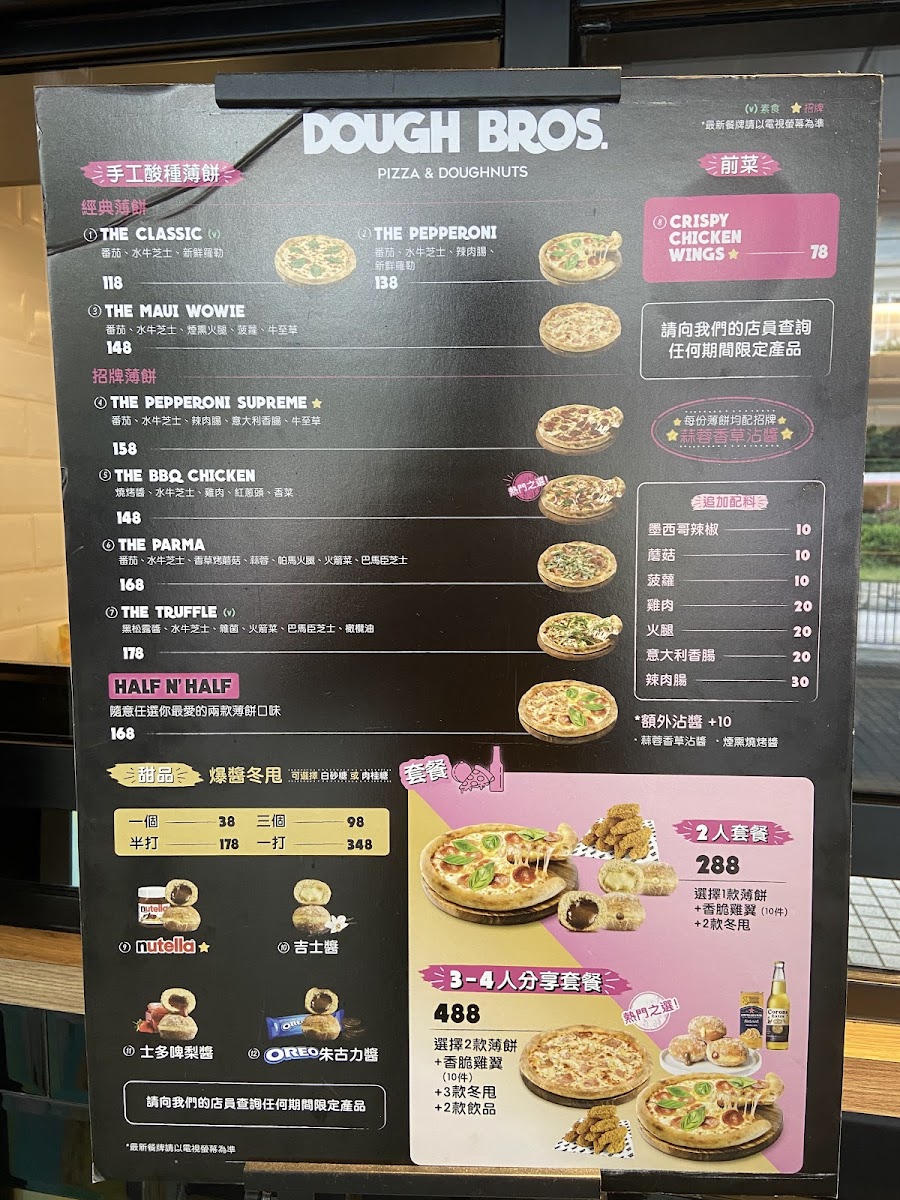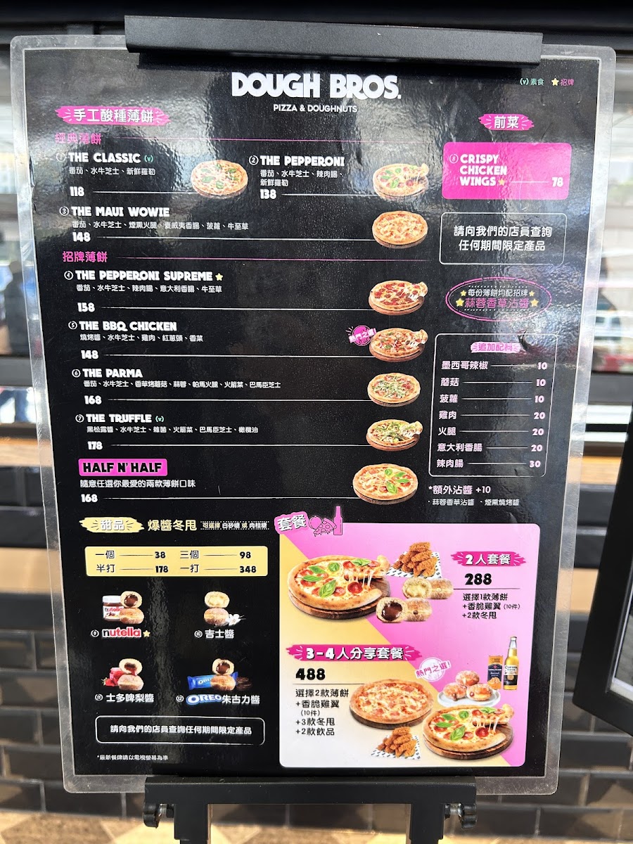 Welcome to Dough Bros Pizza & Doughnuts, the vibrant new gem located at 1號號 Hing Tung St, Tung Chung, Hong Kong. This pizzeria offers a delightful fusion of artisanal pizzas and scrumptious doughnuts, perfect for every palate. Their menu boasts a range of specialty pizzas, such as the indulgent The Truffle and the rich Chicken Pesto. Each pie is handcrafted with a deep, flavorful crust, guaranteeing a satisfying experience in every bite. For those looking for variety, their combo sets cater to all sizes—ideal for a romantic meal or a feast with friends.